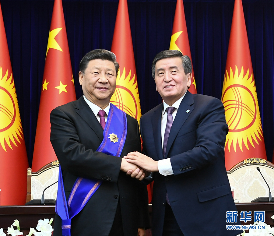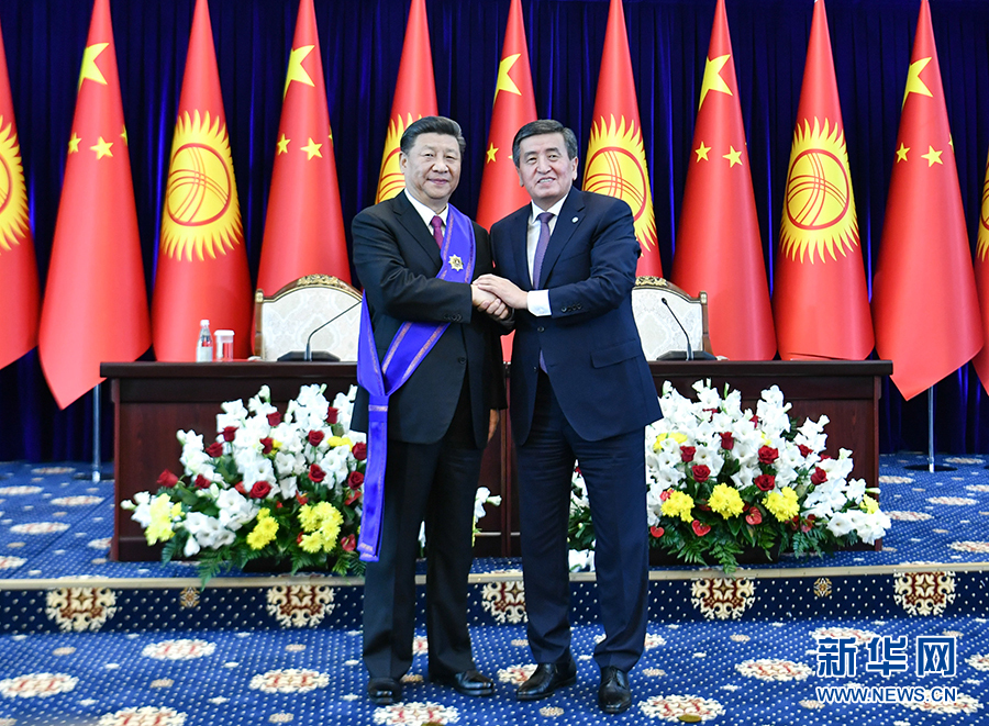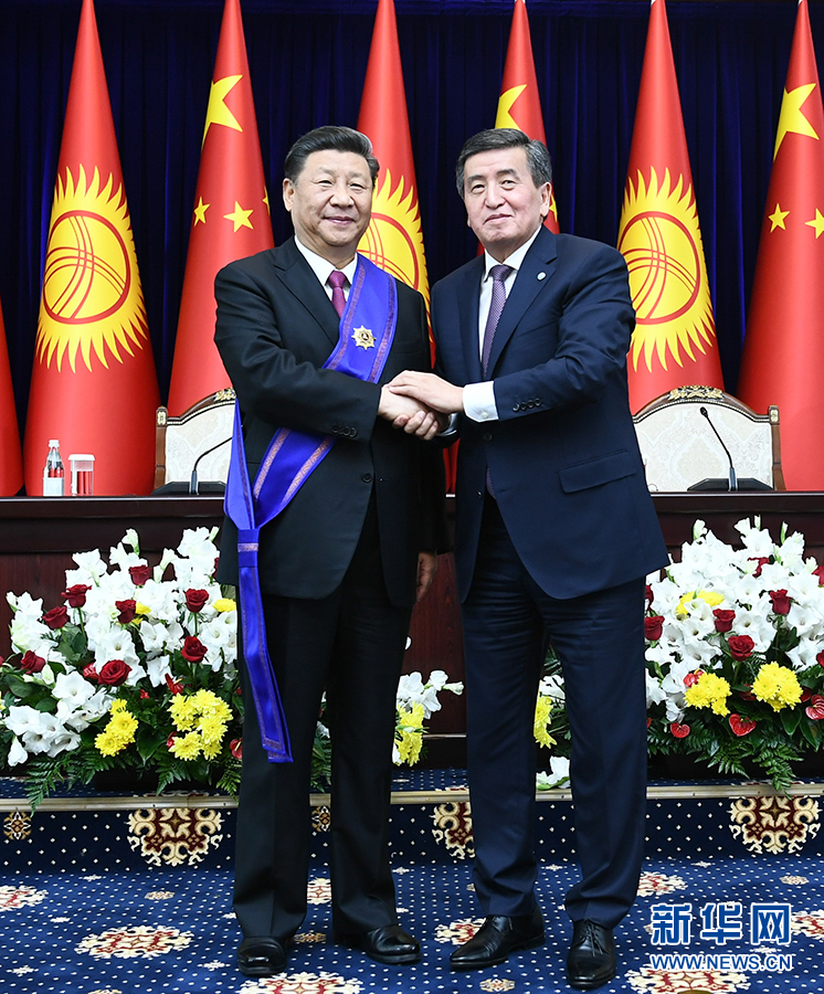 6月13日,國家主席習(xí)近平在比什凱克出席儀式,接受吉爾吉斯斯坦總統(tǒng)熱恩別科夫授予“瑪納斯”一級勛章。